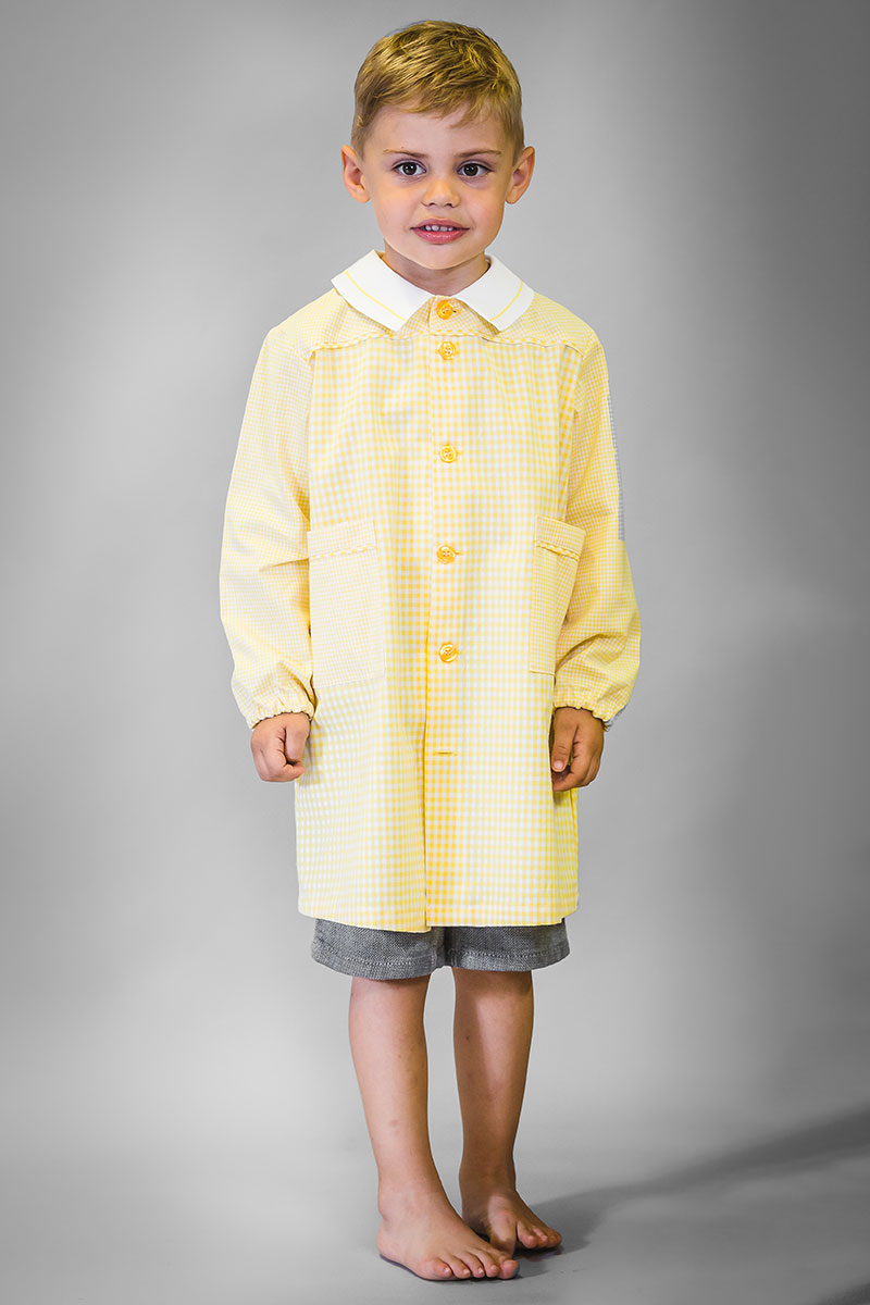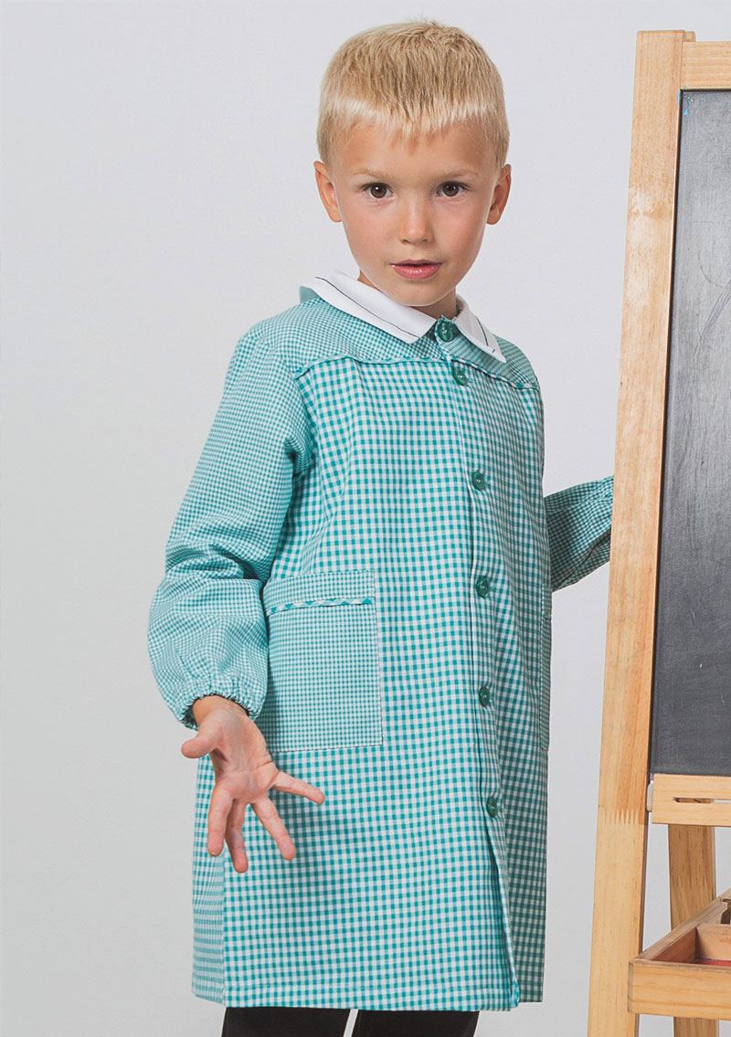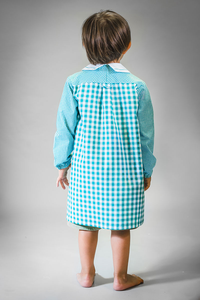 Per rendere gioiosa e allegra la scuola, abbiamo creato un modello che gioca con i quadretti medi, piccoli e grandi, tinta su unita. Il colletto con ricamo verde smeraldo in tinta con i quadretti del grembiulino, rigorosamente confezionato in puro cotone.