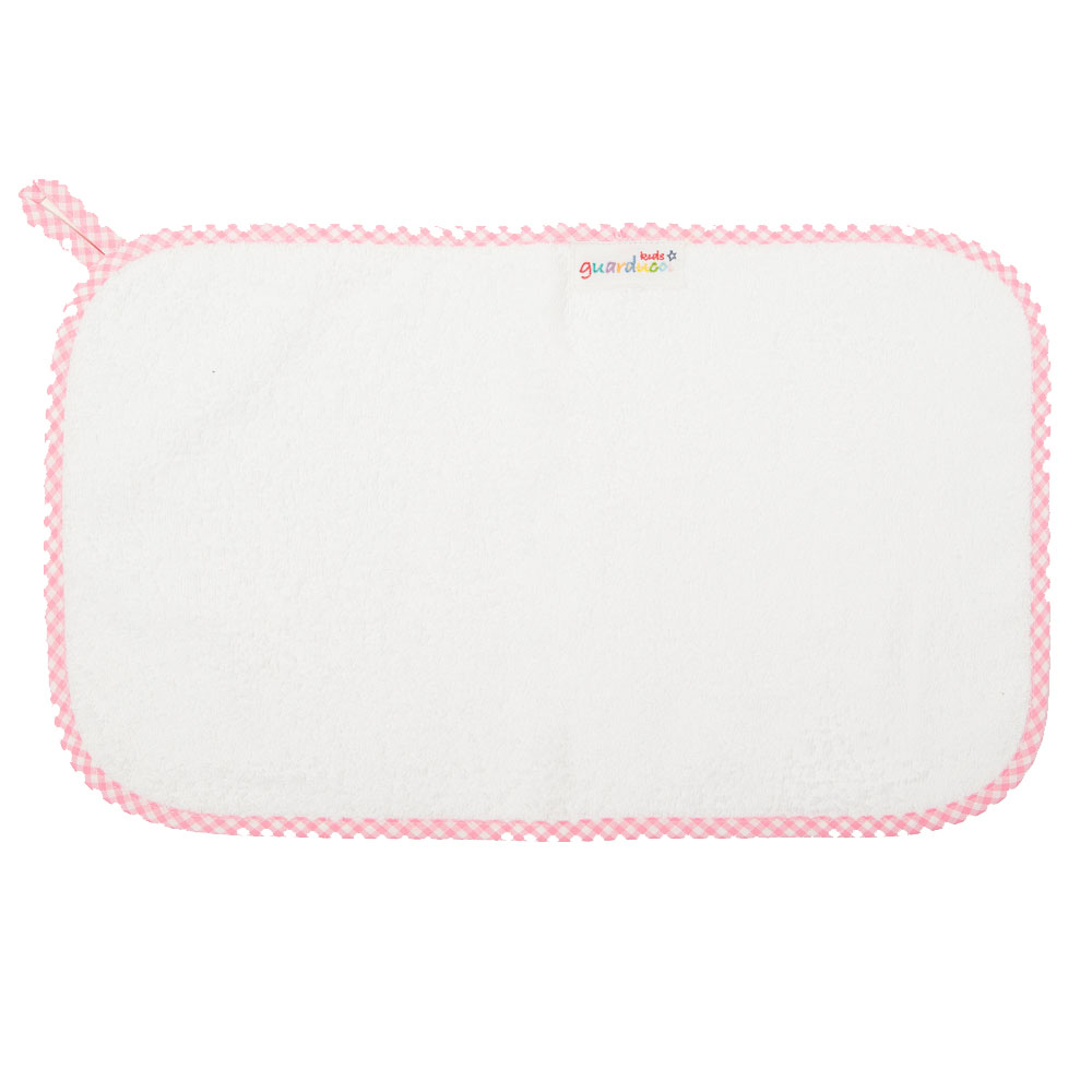 Asciugamano in spugna bianca prodotto e confezionato in Italia, bordato da sbiego come il bavaglino, occhiello per appendino, misure cm 48×30