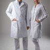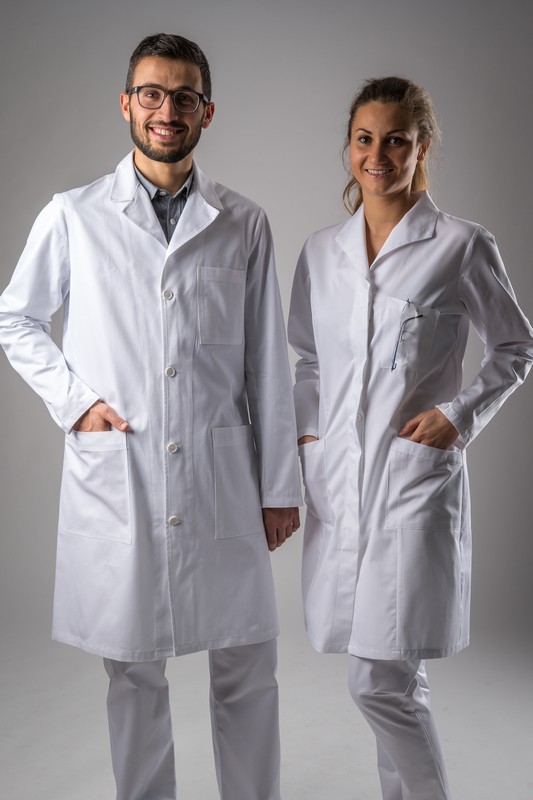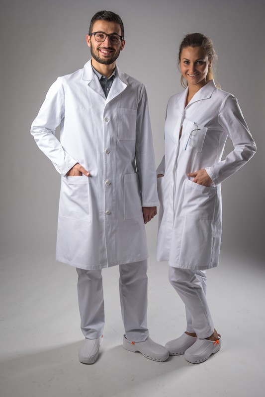 Camice classico da donna, lungo e sfiancato, collo americano, manica lunga con possibilità di arrotolare e fermare con alamaro, due tasche e un taschino applicati davanti.