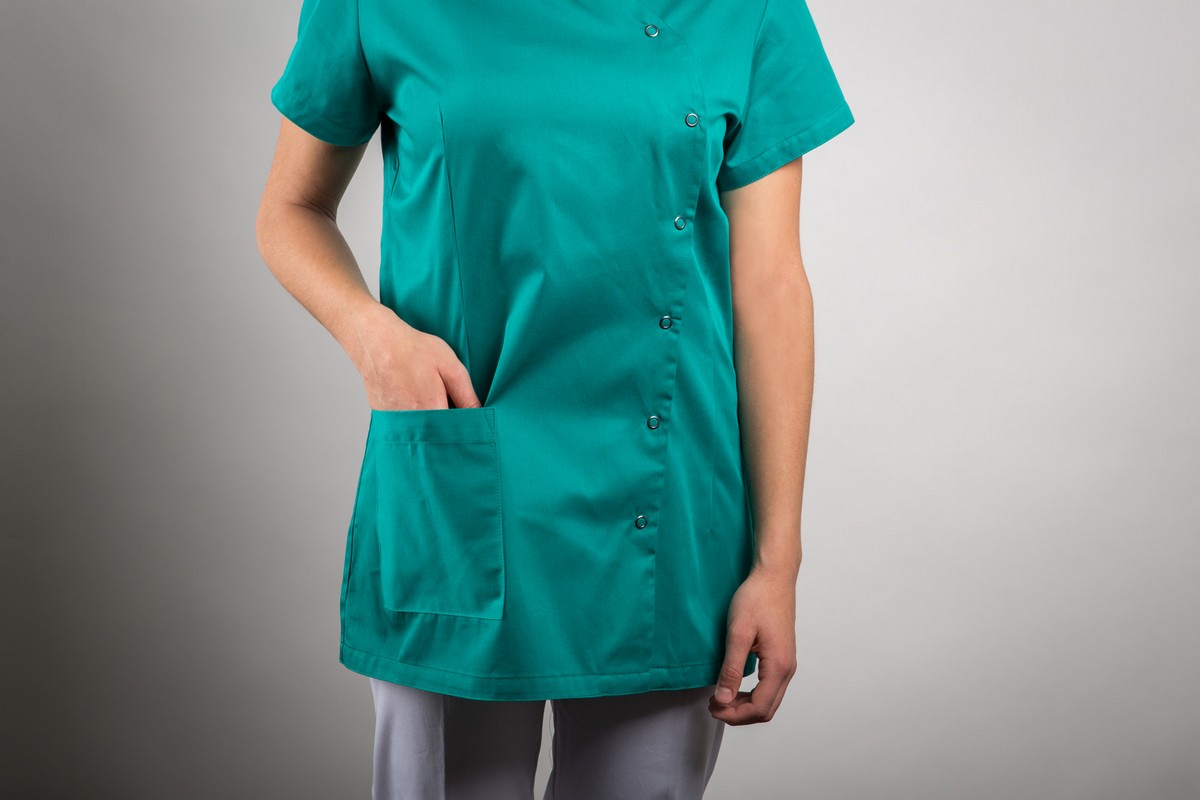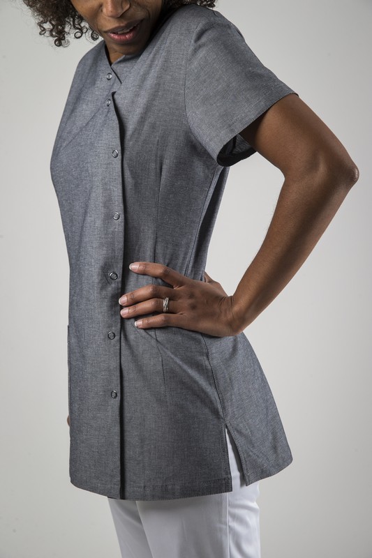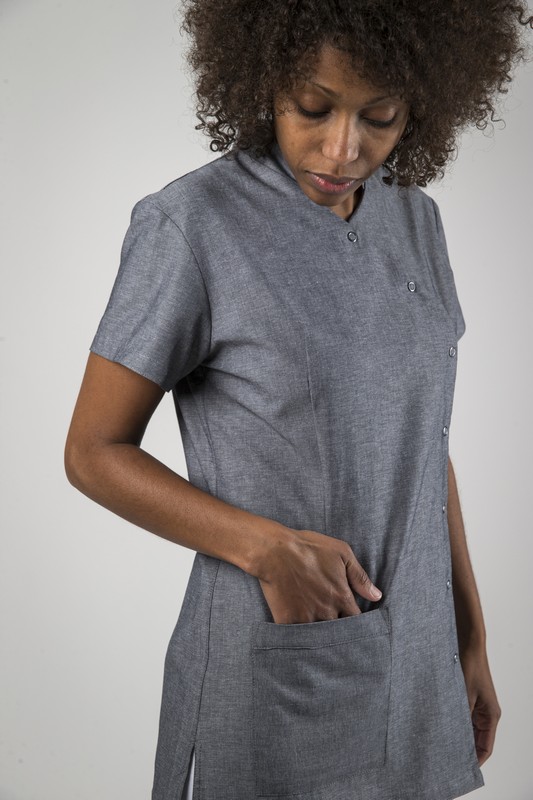 Casacca da donna con allacciatura asimmetrica con pratici bottoni automatici a vista, dalla forma lievemente sciancrata per dare risalto alle forme femminili, vestibilità confortevole grazie al soffietto in rete inserito nel giromanica. Manica corta e tasca applicata a destra.