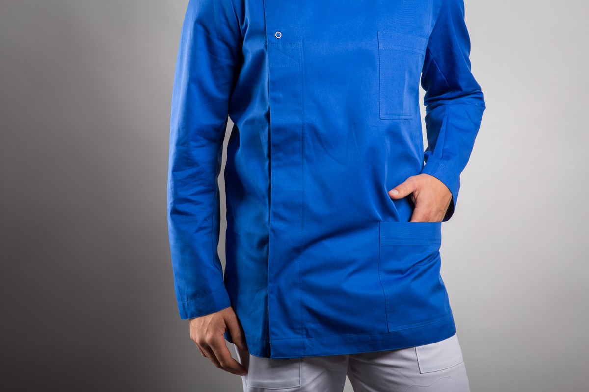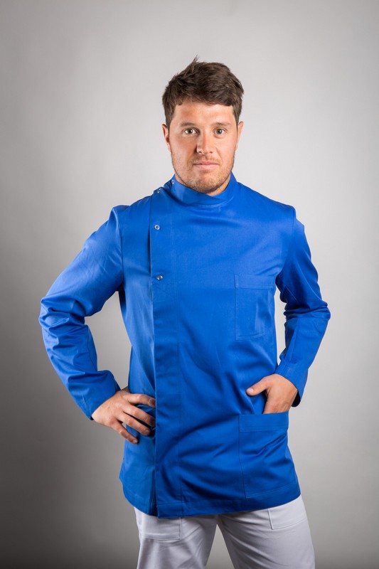Casacca tecnica con bottoni a pressione, vestibilità piuttosto aderente, due tasche e taschino applicati. Cotone 100%.