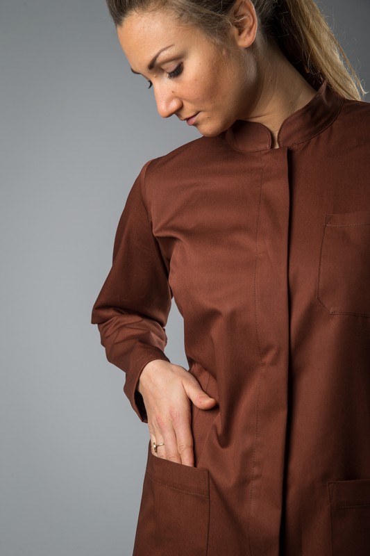 Elegante casacca con linea morbida, leggermente lunga da coprire i fianchi, allacciatura nascosta all’inglese, manica lunga con polsino in maglina di jersey. Ampie tasche e taschino applicato. Collo alla coreana.