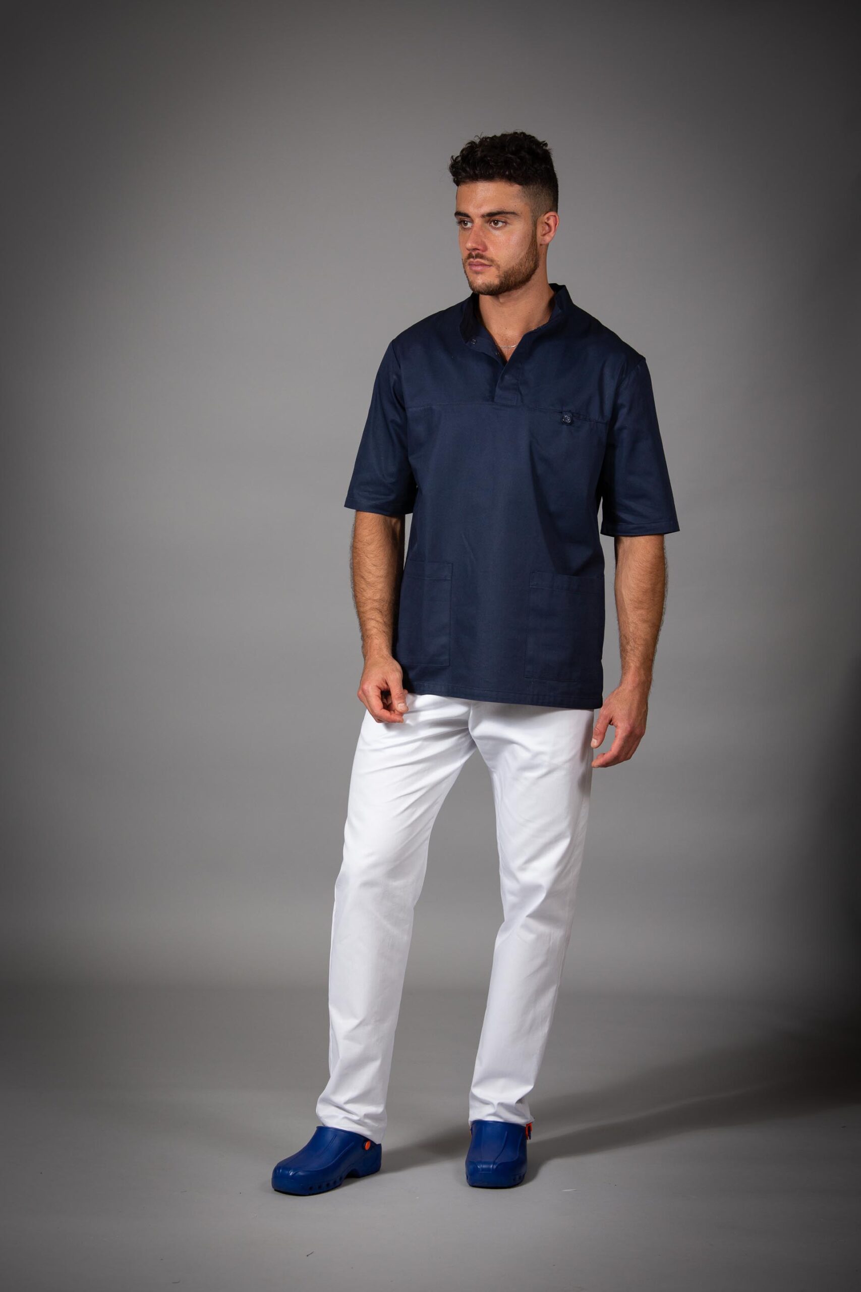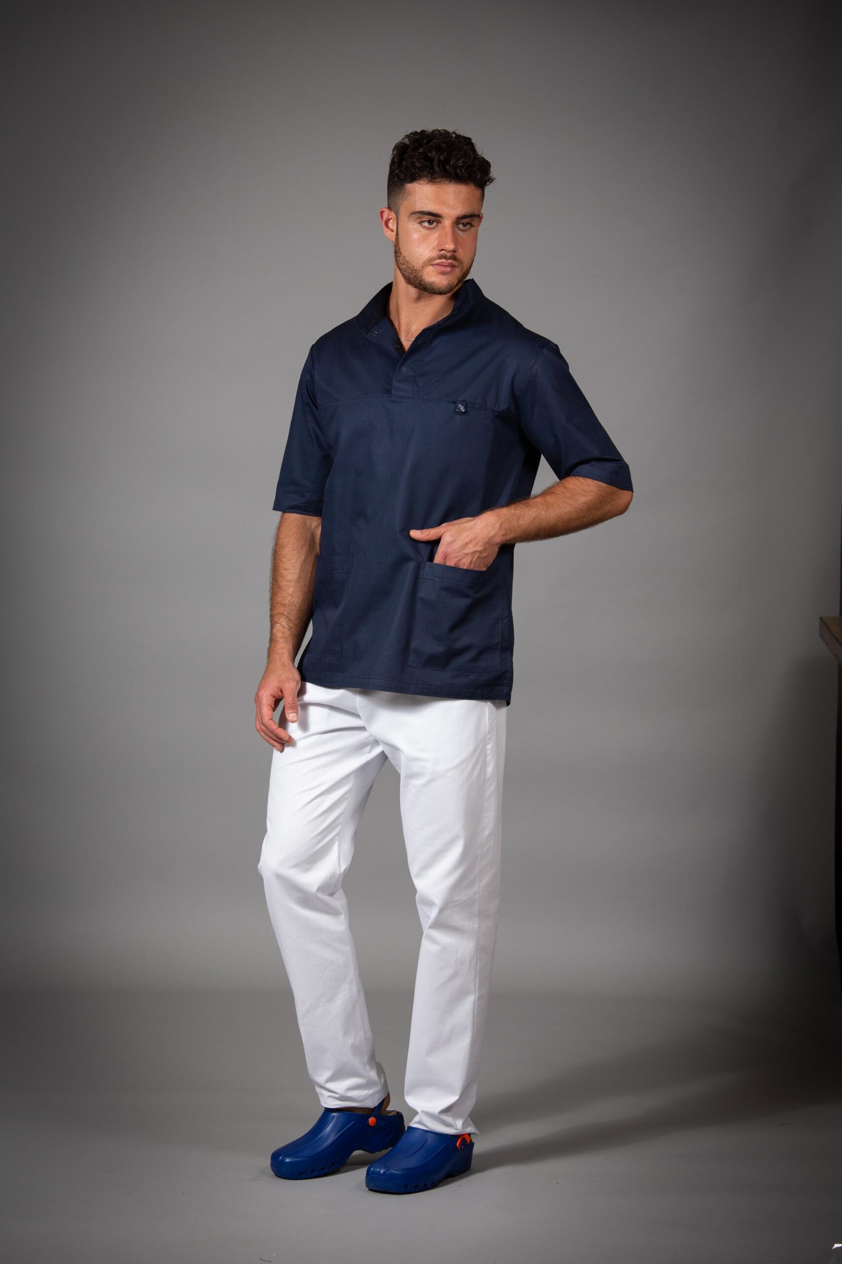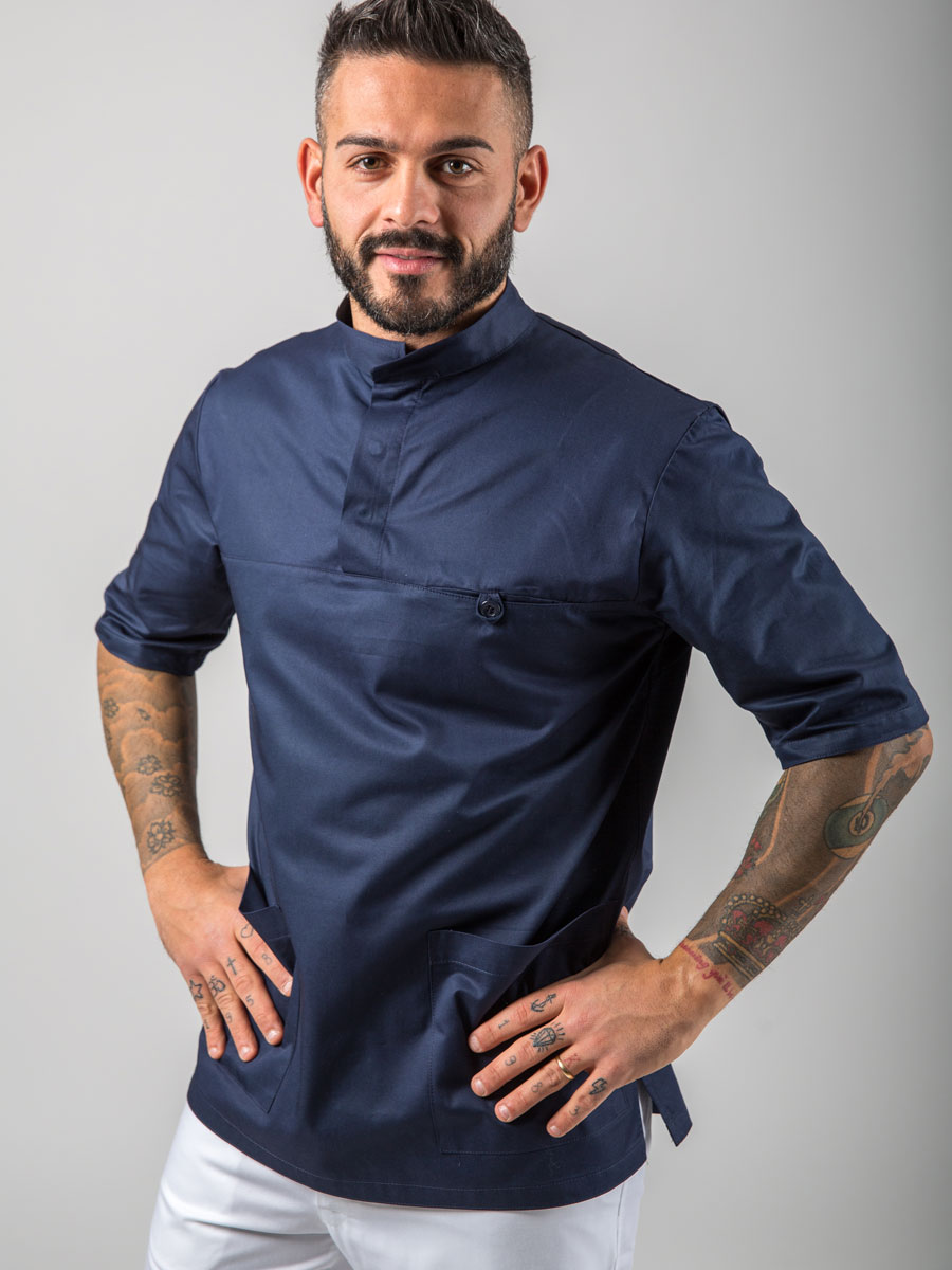 Confortevole casacca da uomo, allacciatura con 3 pratici bottoni a pressione nascosti, con soffietto nel giromanica dietro, pratica contropiega nel centro schiena per i movimenti, due tasche applicate e un taschino interno a filetto. Manica corta.