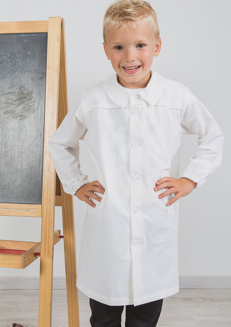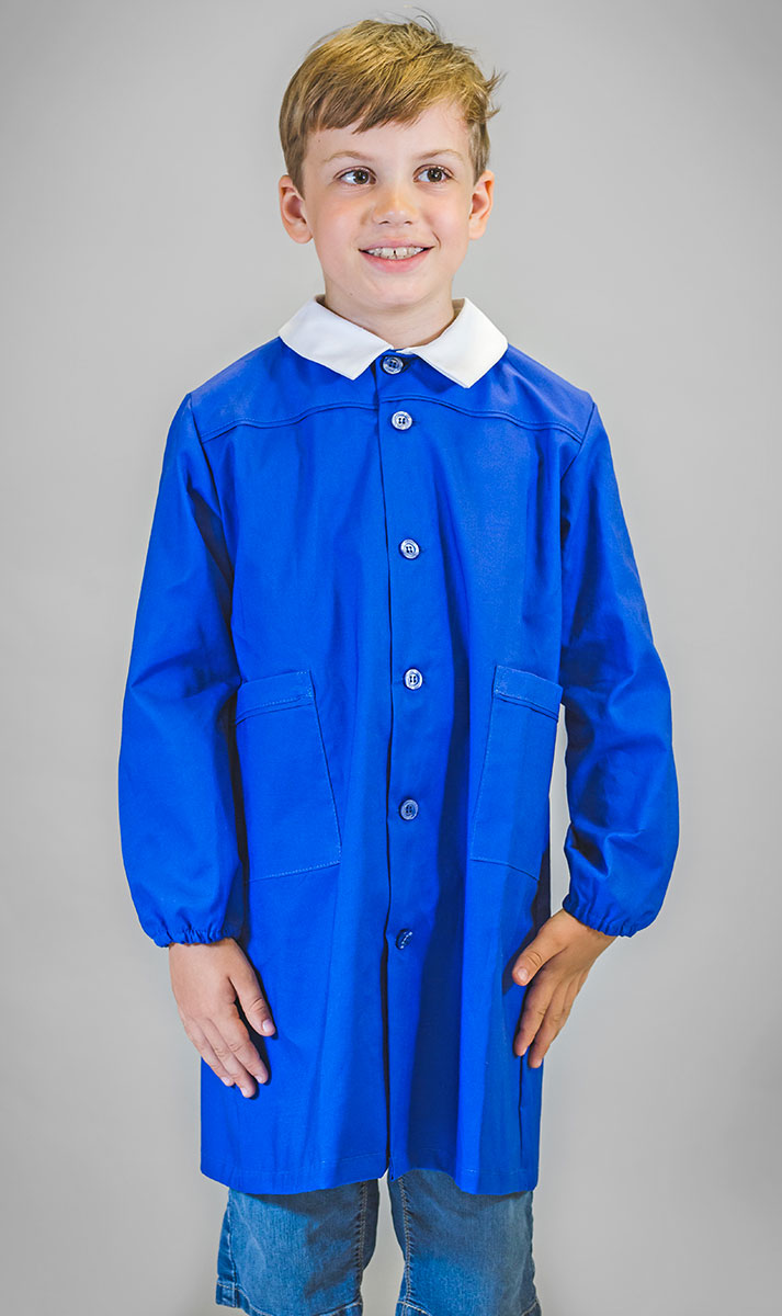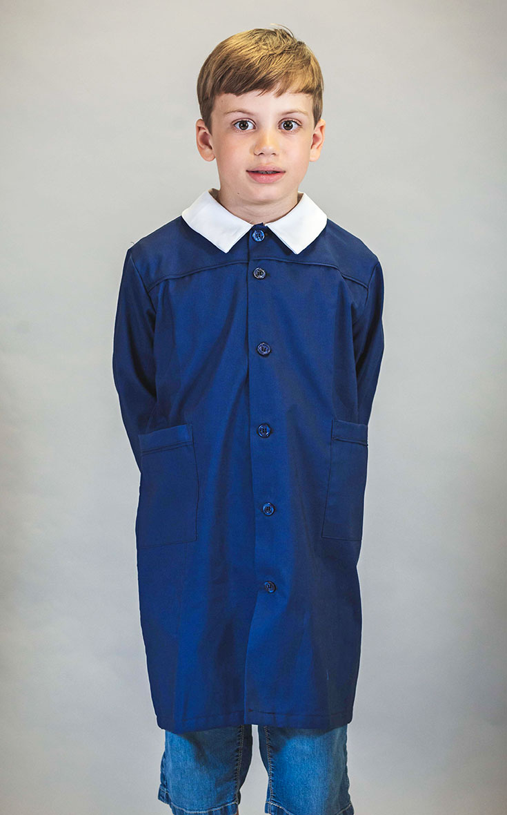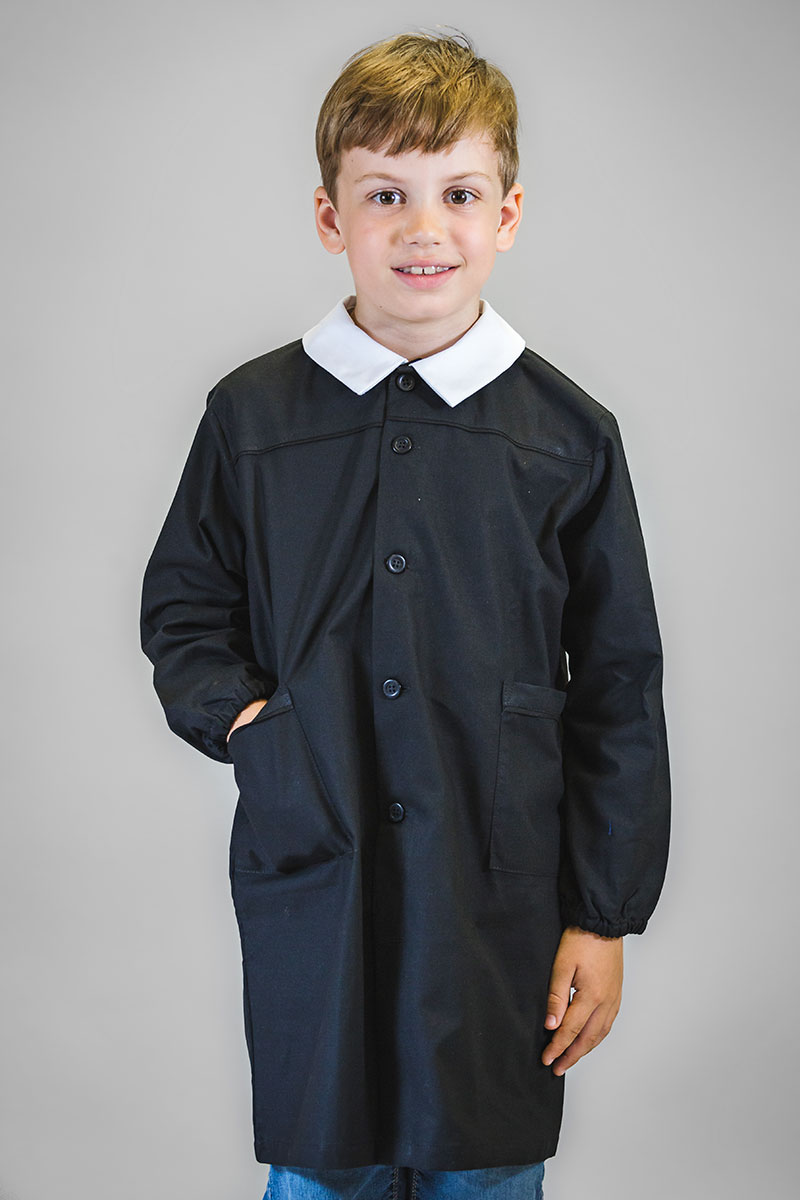 Grembiulino confezionato con tessuto in puro cotone, colletto bianco (staccabile con bottoncini nei COLORI BLU E NERO – per lavare separatamente), sprone alle spalle e contropiega sulla schiena, elastico ai polsi, due tasche rettangolari.