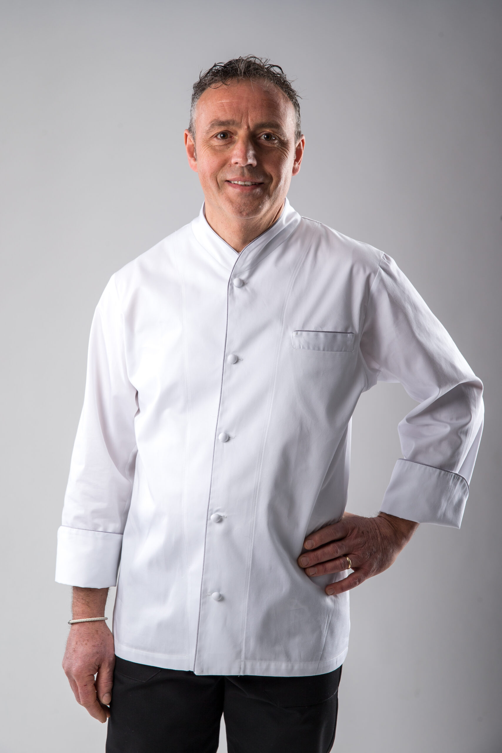 Elegante giacca da cuoco da uomo con filetto a contrasto, vestibilità leggermente aderente. Bottoni foderati in tessuto e cuciti a mano, taschino a filetto, fori di areazione. Manica lunga a 3/4 con ampio risvolto.