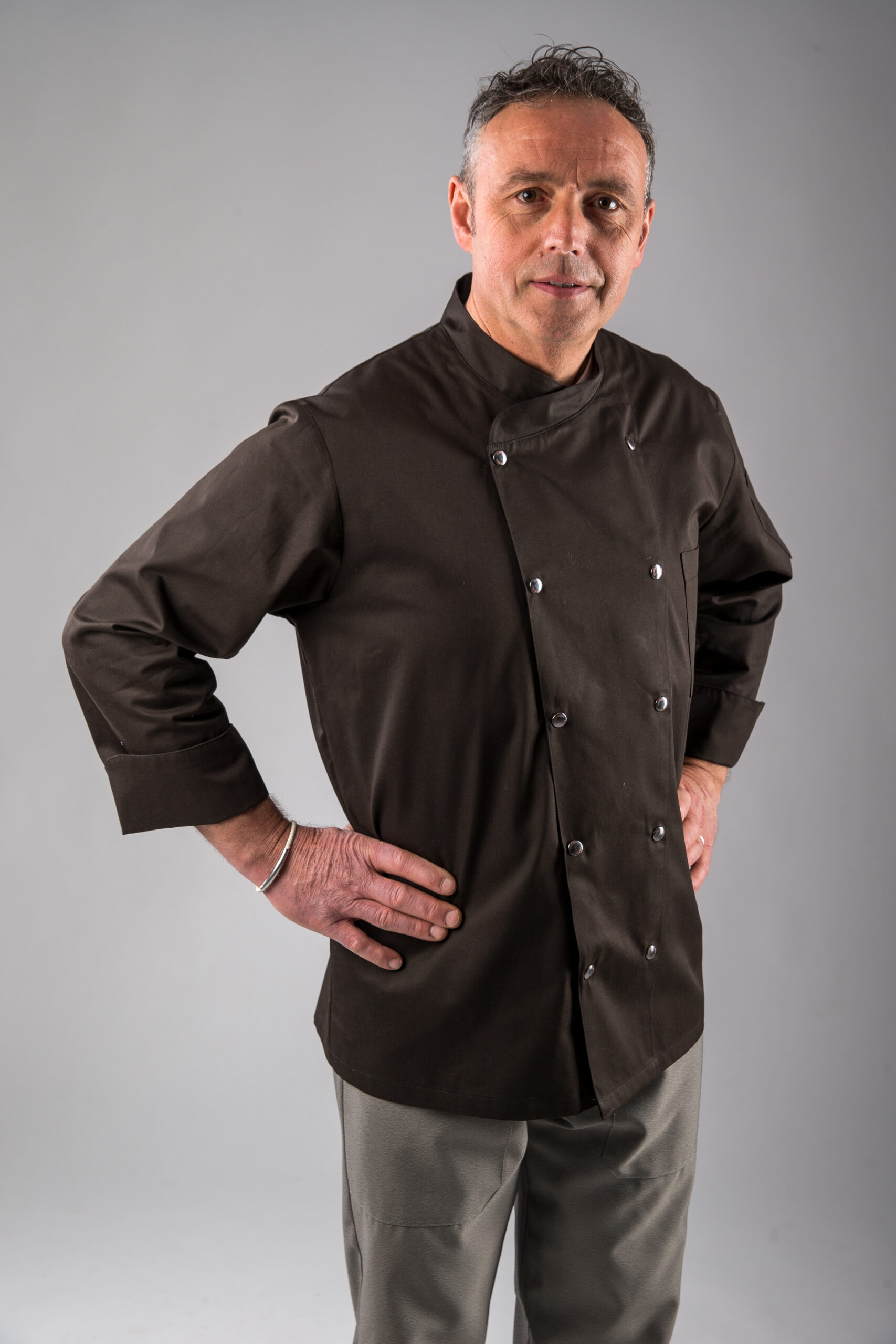 Giacca doppio petto, collo scialle incrociato, pratici bottoni a pressione. Tre i tessuti disponibili perquesto elegante modello: Cotone 100% (Indanthrene o Drill), misto Cotone/Poliestere.