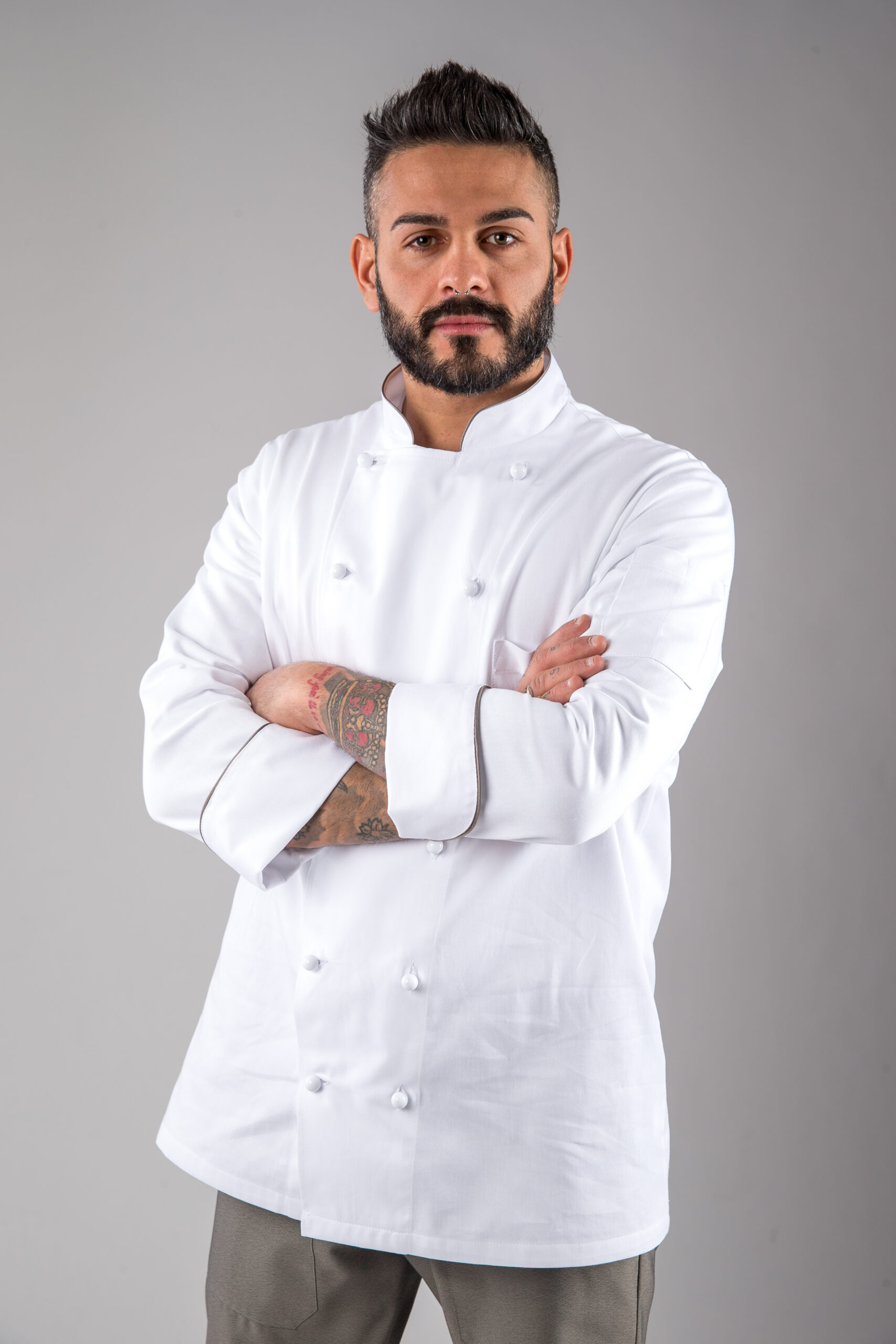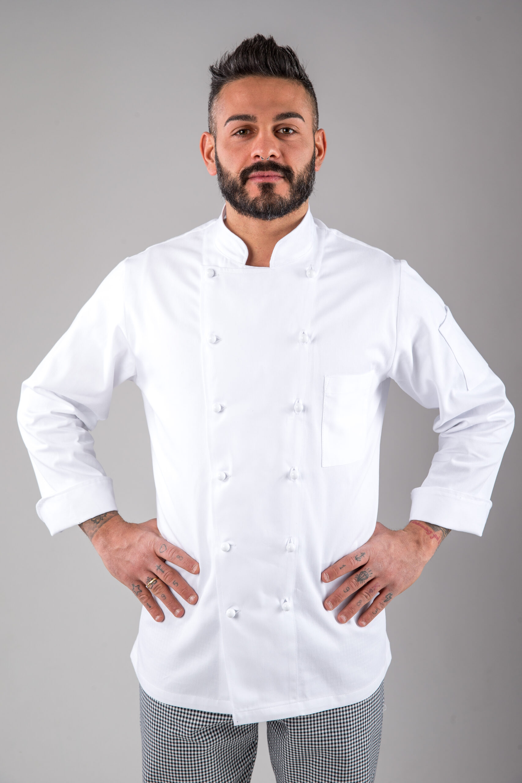 Classica giacca da cuoco, collo coreana aperto, taschino applicato sul cuore e sulla manica. In dotazione bottoni bianchi antipanico e 12 bottoni neri di riserva. Manica lunga 3/4 con ampio risvolto.