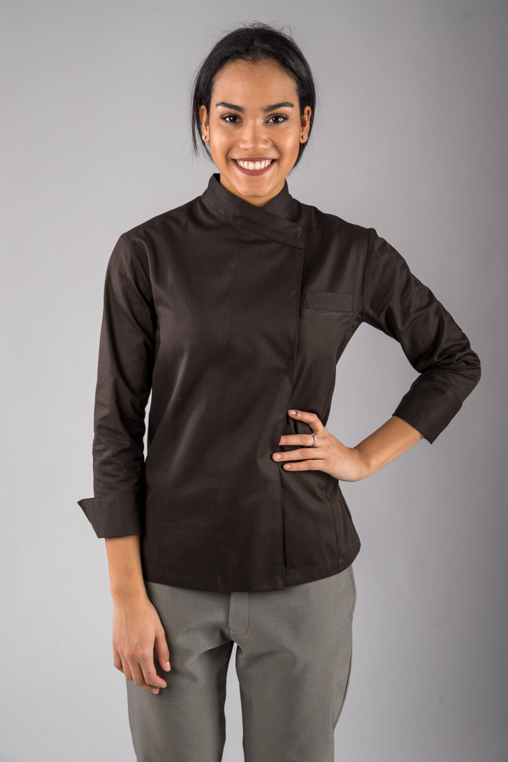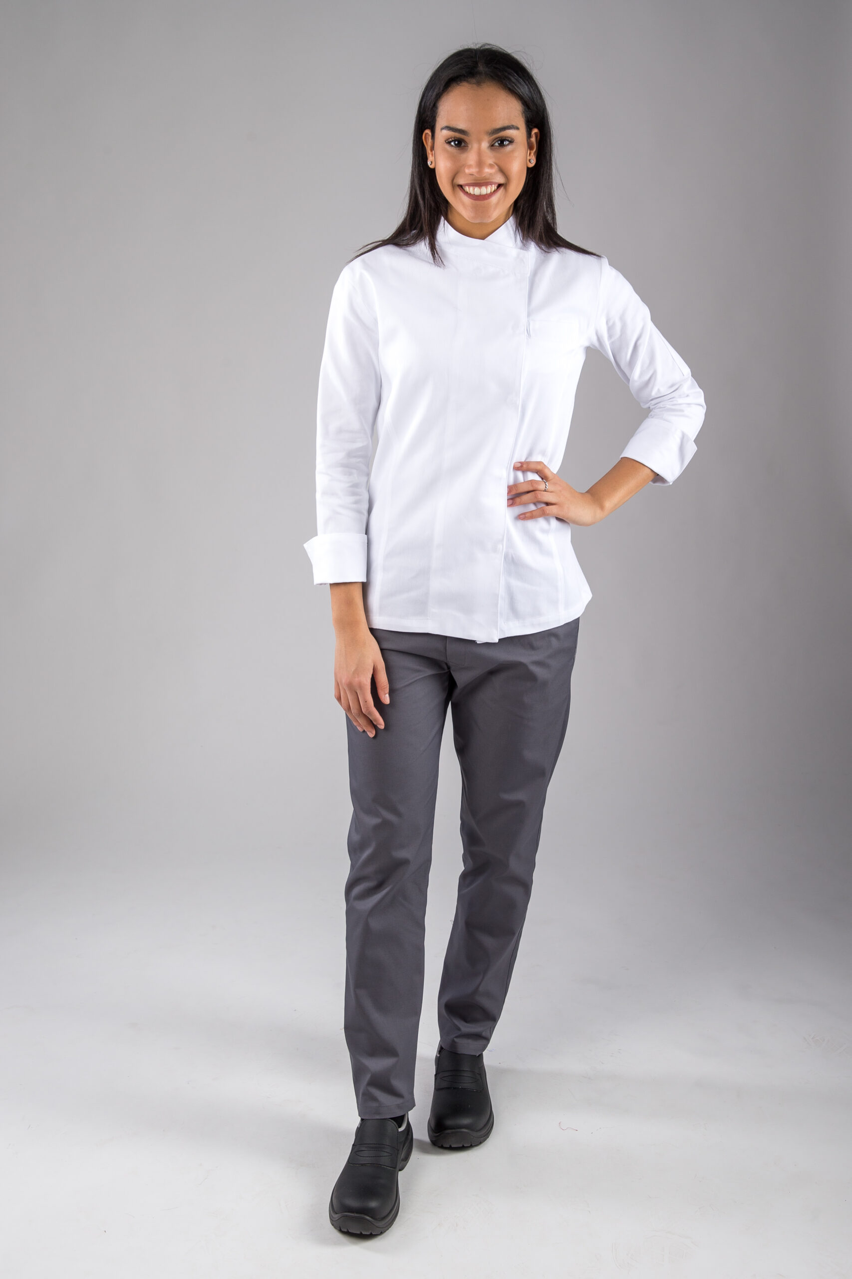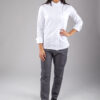 Allacciatura nascosta asimmetrica con bottoni automatici, taschino sulla manica, piccoli spacchi dietro. Disponibile in cotone 100% o misto cotone/poliestere.
