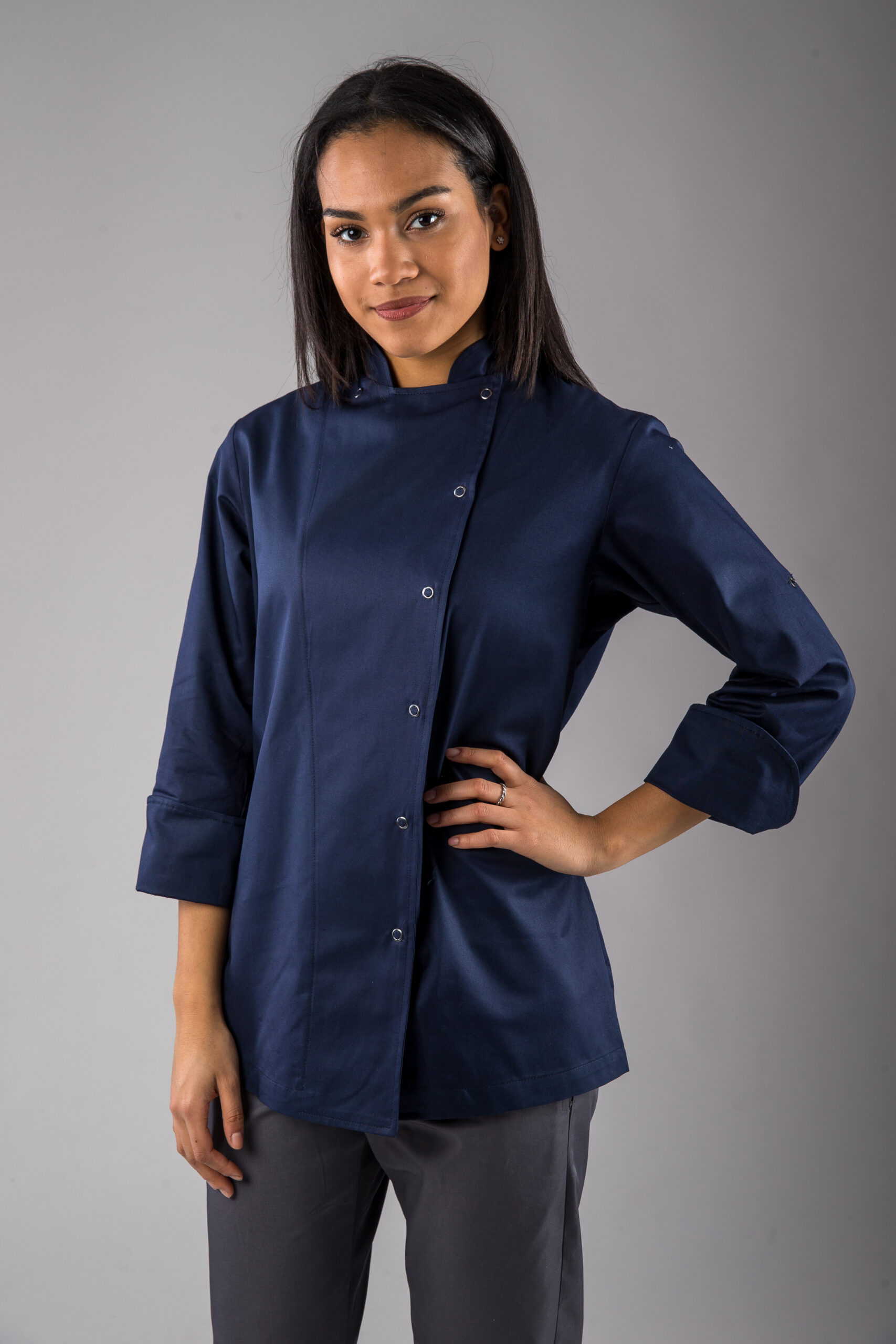 Giacca da cuoco, donna, doppio petto con bottoni automatici ad anello, vestibilità morbida.