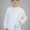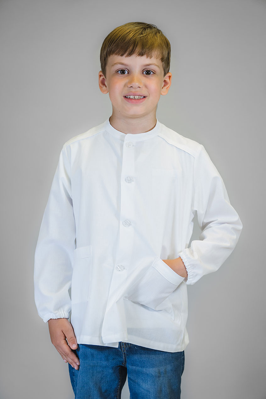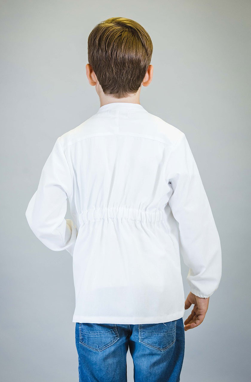 Casacca in stile sahariana per il grembiule per la scuola elementare. In Zefir di puro Cotone arricciato dietro con elastico regolabile in vita, con tasche applicate e colletto alla coreana e manica lunga con pratico elastico ai polsi.