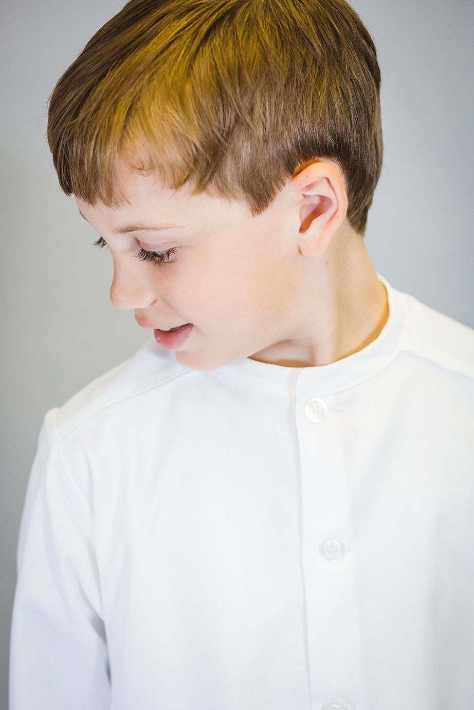In tessuto di puro cotone 100% Zefir. Tessuto prodotto e tinto in Italia, casacca confezionata interamente nei nostri laboratori a Trento.