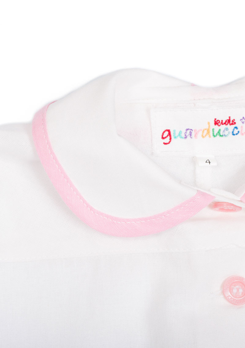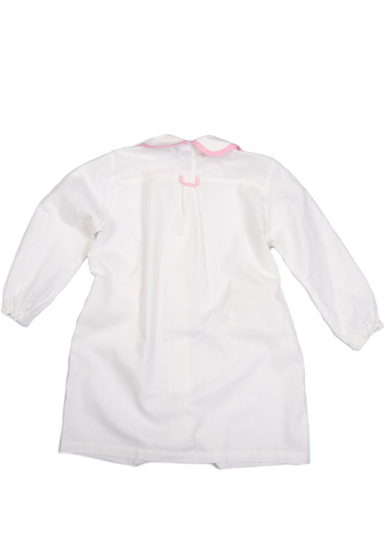 Il candido grembiulino bianco per bambina pensato per la scuola materna, con bottoni e bordini in contrasto color rosa, in morbido zephir di puro cotone con tasche arricciate e elastico ai polsi.