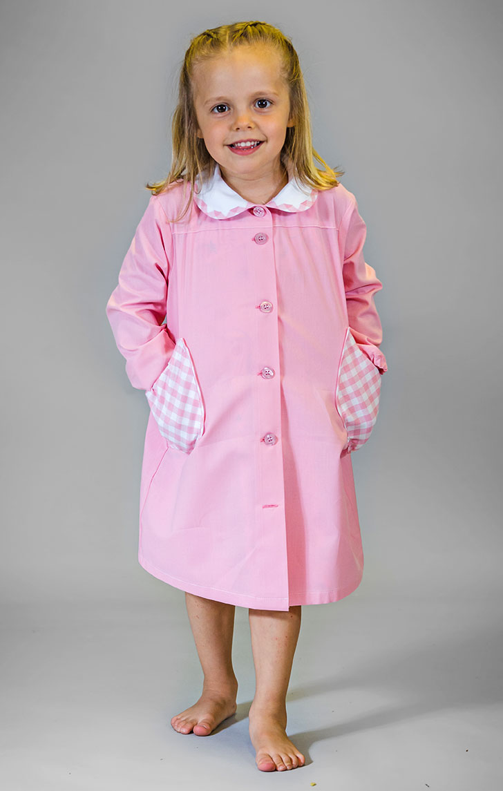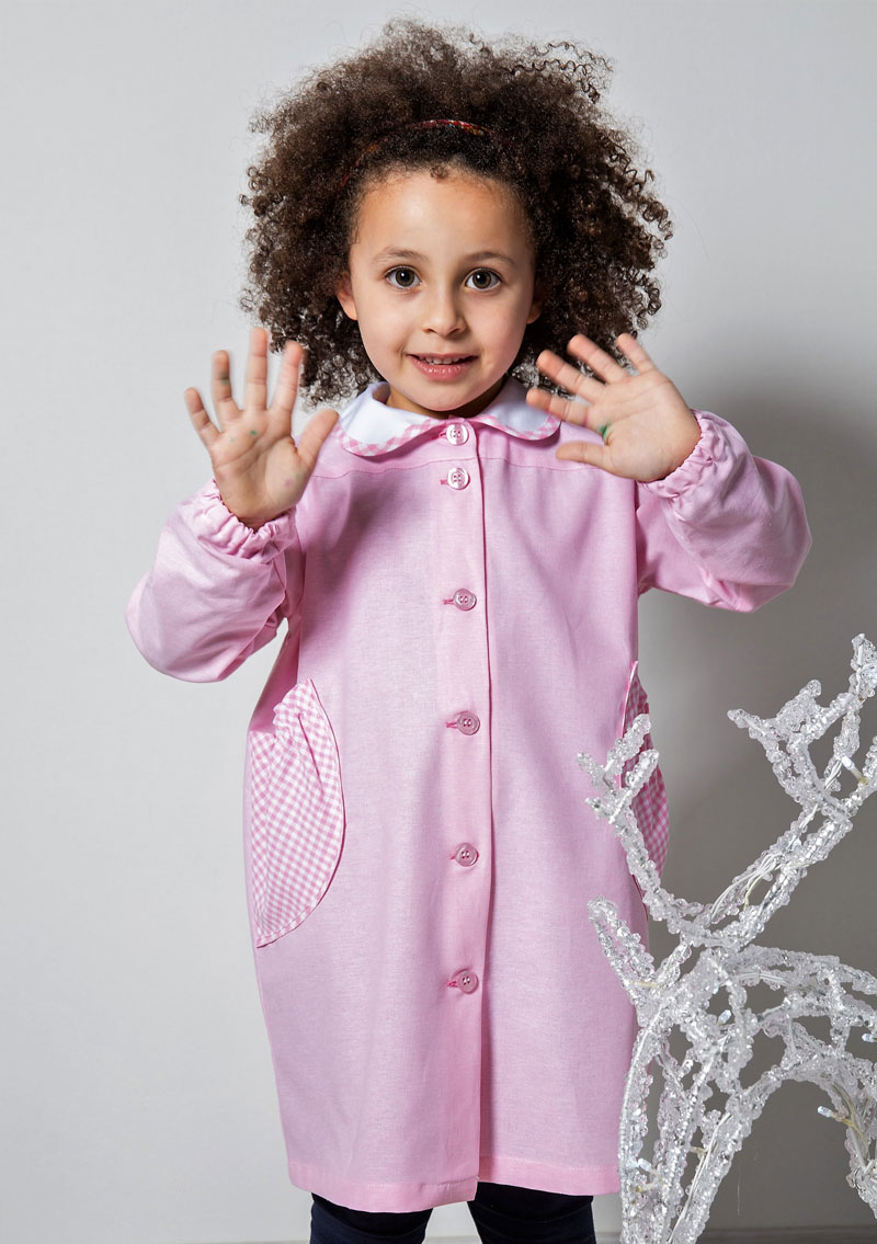 Grembiule per la Scuola Materna realizzato in Oxford rosa di Puro Cotone Zefir, tasche arricciate con profilo in tinta con il bordino del colletto bianco. Alto confort e traspirabilità per la tua bambina.