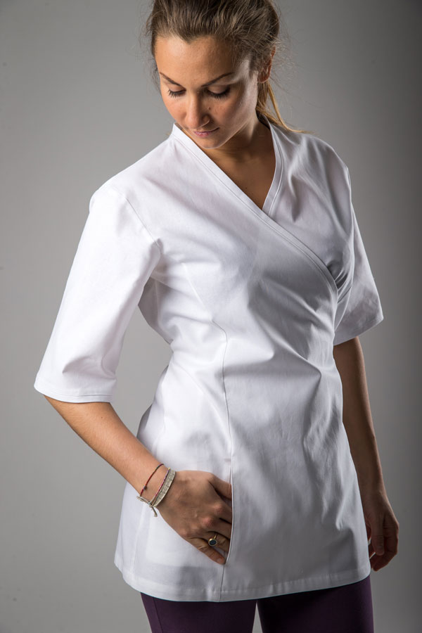 Casacca pensata per l’estetista, incrociata davanti con allacciatura laterale, tasca laterale a scomparsa, fianchetti per esaltare le forme, due riprese sulla schiena in vita, manica a tre quarti al gomito, alamaro con bottone al suo interno per poterla accorciare. Possibilità di allacciare la casacca sia a destra che a sinistra e poter invertire la sovrapposizione del davanti.
